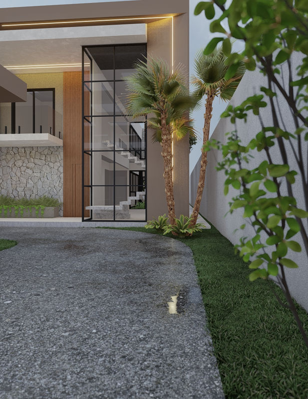 A combinação entre revestimentos — como a pedra natural, o painel amadeirado e as superfícies neutras — cria uma identidade sofisticada e acolhedora, reforçando o contraste entre texturas e destacando os planos arquitetônicos. A marquise inclinada, apoiada por pilares estruturais em destaque, confere dinamismo à composição e marca o acesso principal de forma expressiva.